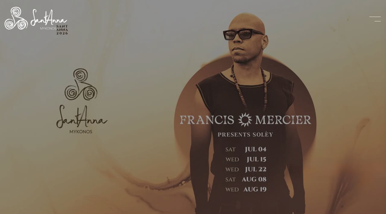 A Sonic Ritual The sun rises at SantAnna. This summer, we invite you to an evocative realm where the sounds of the Levant, Africa, and the Caribbean collide under the Mykonian sky. Solèy (meaning “sun” in Haitian Creole) is a global community that connects cultures through joy and movement. More than a performance, each residency date is a multisensory journey. Experience a vibrant, organic house language enriched with live djembe, guitar, and choreographed dance performances, all set against the breathtaking backdrop of Paraga.